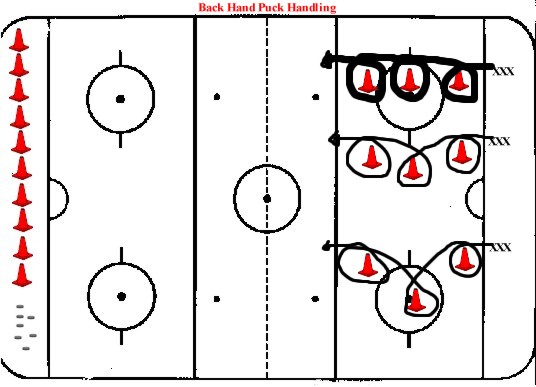 Purpose: Develop a player's ability to control the puck using only the backhand side of the blade. Only correct cupping of the puck will allow the skater to move fluidly through the cones using only the backhand. Skaters should develop to keep the puck ahead of them then to follow the puck around the cones. Strong development of the backhand will transfer to a better understanding and use of the forehand puck handling.