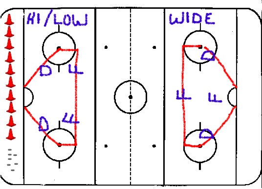 Purpose: Develop a standard TEAM defensive zone coverage that assigns specific responsibilities to specific positions for keeping the puck out of the House. Develops players ability to react to specific game scenarios to control the movement of the puck and attack of the opposite team. Players should develop restraint from attacking the puck handler and learn the possible angles of attack.
